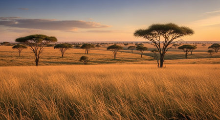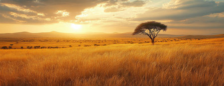 An African savanna landscape at sunset, with golden skies illuminating the tranquil, endless plains in a dramatic, banner