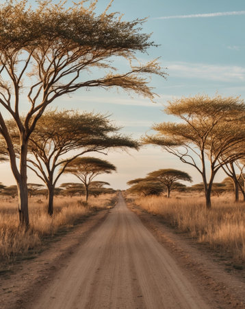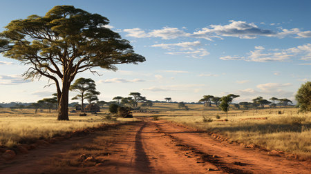 AI Generated. A dirt road flanked by acacia trees in a sunlit savanna landscape during the golden hour