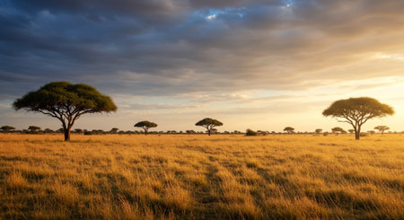 A breathtaking golden sunset illuminates the African savannah, showcasing acacia trees silhouetted against a dramatic cloud-filled sky, embodying tranquility.