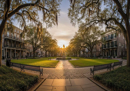 Golden sunlight cascades through the ancient oak trees in a serene Savannah street, inviting peaceful morning walks in the historic district. The cobblestone pathway adds charm to the scene.