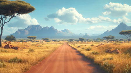 Explore a serene dusty road set against a stunning African landscape, highlighted by majestic mountains and vibrant grasslands under a bright sky.