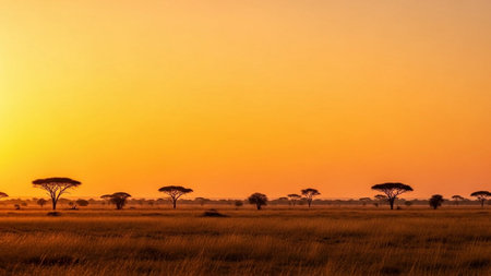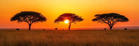 A breathtaking sunset over an African savanna, showcasing acacia trees silhouetted against a golden sky. The scene is tranquil and majestic, with a warm, peaceful atmosphere. The landscape is a combination of a dry meadow and an orange, warm sky.
