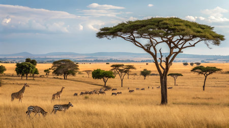 A solitary acacia tree rises above golden grass in the African savanna while giraffes roam peacefully in the background on a sunny day.