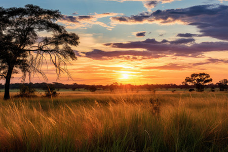 Landscape of the African grasslands at sunset