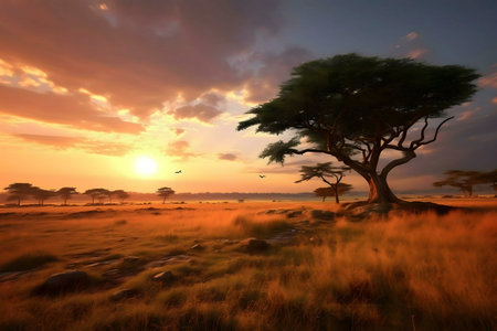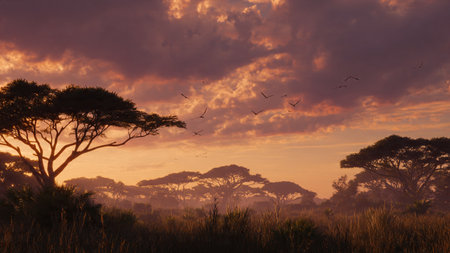 African savannah sunset with acacia trees and birds in the sky