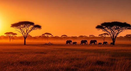 A serene savannah landscape at sunset with elephants and acacia trees