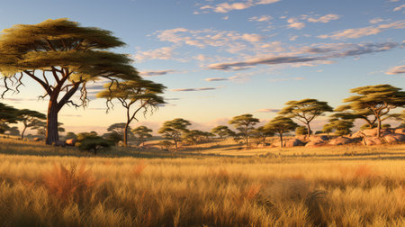 savanna stretches across the prairie landscape in this vibrant pixel art, showcasing a serene atmosphere with rolling hills, scattered acacia trees, and a warm golden light casting long shadows, evoking feelings of tranquility and adventure in the heart of the african wilderness. ai generated