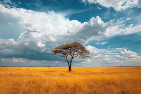 Lone Acacia Tree in African Savanna with Golden Grass and Blue Sky