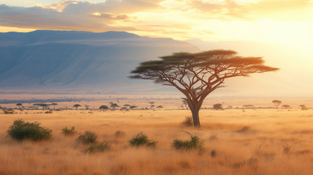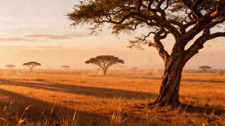 A breathtaking panorama of the African savanna at sunrise, showcasing a golden sky, lush vegetation, and a gentle haze creating a serene atmosphere