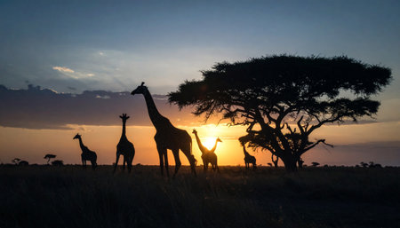 African savanna at sunset with giraffes and acacia trees