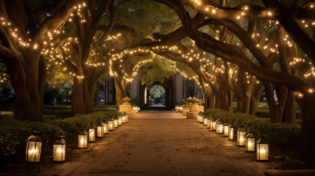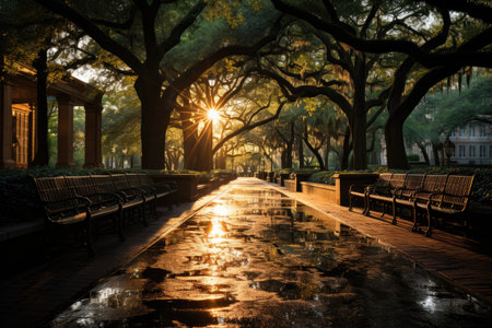 Sunlight streaming through old oak trees in a park in Florida. Beautiful savannah landscape view on a sunny day, AI GeneratedSunlight streaming through old oak trees in a park in Florida. Beautiful savannah landscape view on a sunny day, AI Generated