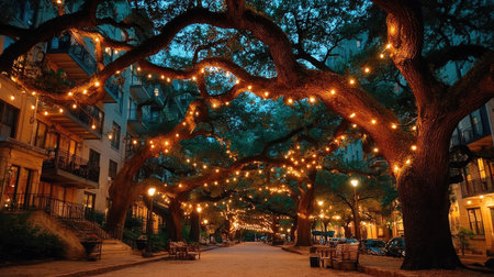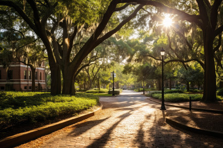 Charming Scene Savannah's historic squares with oaks and Spanish moss., generative AI