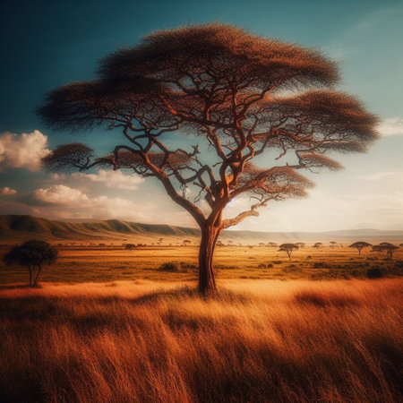 Sunset over a vast savanna with golden grasslands and a silhouette of an acacia tree