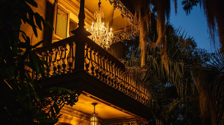 Fantasy balcony with chandelier at night