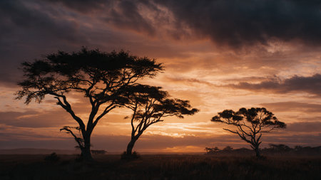 Majestic golden sunrise over the horizon, vibrant colors illuminating acacia trees in the landscape.