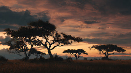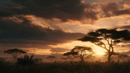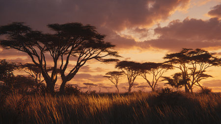 A breathtaking savanna scene showcases golden grasses swaying under the gentle breeze, with striking acacia trees set against a dramatically lit sky in an African landscape.