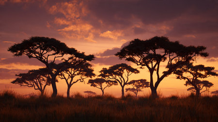 sunset over acacia trees and vast grasslands, created with generative ai