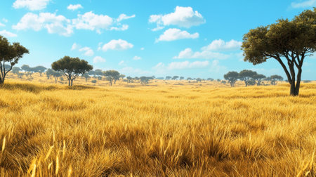 Golden grass stretches endlessly across the landscape, dotted with sparse trees under a clear blue sky filled with scattered clouds on a sunny day.