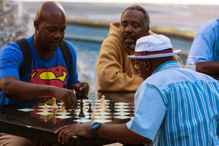 Atlanta, GA, USA - October 8, 2016: African-American men play chess on a community chess table at Woodruff Park in downtown Atlanta on October 8, 2016 in Atlanta, GA.