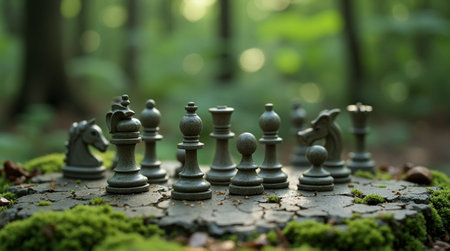 Chess game pieces are arranged on mossy wood in a forest setting, bathed in soft, natural green hues.
