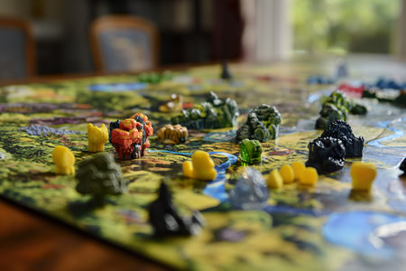 A close-up of a board game on a table reveals the intricate details of the game pieces and the immersive