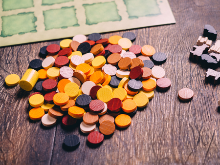Board game Carcassonne. Party entertainment or family leisure hobby. play together. Strategic and economic table game. Concept of fun time. Different colors chips. wooden meple figures. close-up.