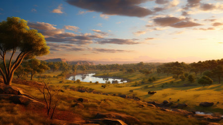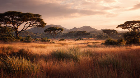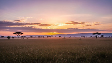 A breathtaking panorama of the African savanna at sunrise, showcasing a golden sky, lush vegetation, and a gentle haze creating a serene atmosphere