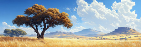 Scenic savanna landscape with acacia tree and beautiful sky