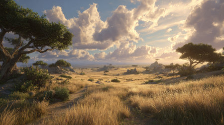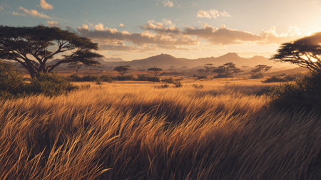 Golden sunset over vast savanna with scattered acacia trees