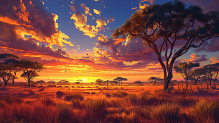 African savannah sunset with acacia trees and birds in the sky