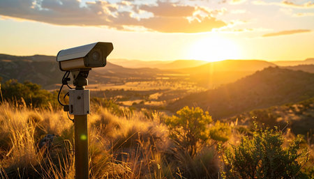 As the sun sets in a blaze of golden light over a tranquil valley, a modern surveillance camera stands as a silent sentinel. This image captures the intersection of technology and the natural world, evoking themes of security, environmental monitoring, and the quiet observation of untouched landscapes.