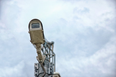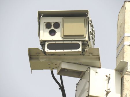 The concept of video surveillance and security technology. CCTV camera on the background of a four-lane road with a traffic jam. Tint.