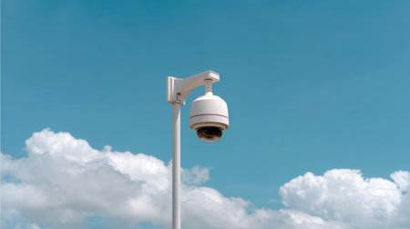 A modern surveillance camera set against a clear sky emphasizing urban security.