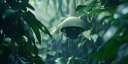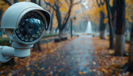 A vigilant security device peers through vivid autumn leaves, blending modern surveillance with the colorful natural backdrop of fading foliage.