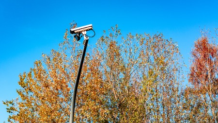 Modern surveillance cameras on the street. Cctv equipment. Blue sky on the background. Protection and control concept.