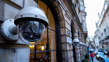 A security camera is installed on the buildings facade, overlooking the city streets with its sleek metal body. It watches over the vehicles and pedestrians on the sidewalk below