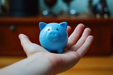 Piggy bank in the shape of a blue pig on the palm of a hand, indoors, with furniture out of focus in the background.