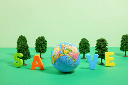 Environmental protection concept with a globe on a wooden table and the word Save the planet!