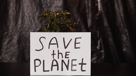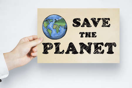 Cardboard sign with text that reads: Save the planet. Concept of environmental care