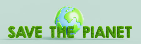 3d save the planet text of green grass letters with earth globe. World earth day concept. Environment protection, renewable energy, sustainable development eco conservation render