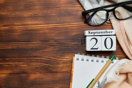 Wooden white block calendar with date october 20 on beige background with shadow. Creative layout, planning, holidays