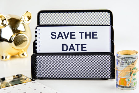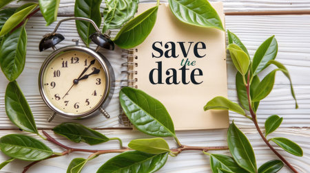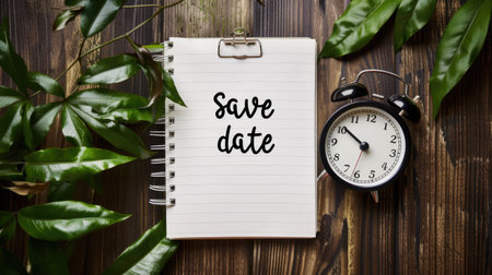 the text save date written on blank notebook paper, with an alarm clock beside it, wooden background