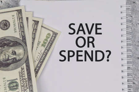 Finance concept.Text SPEND OR SAVE on colorful paper note with calculator and dollar banknote on yellow background.