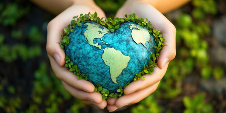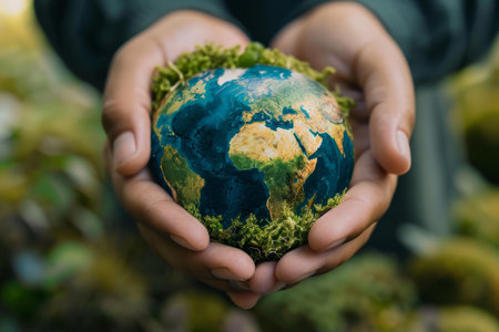 Globe cradled by hands amidst lush greenery, representing environmental conservation