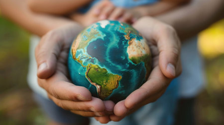 Two hands hold gently a detailed depiction of Earth, showing its blue oceans and green continents. Generative AI