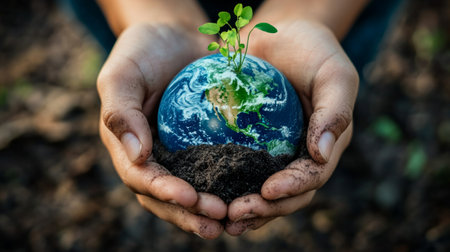 Hands covered in soil holding realistic miniature Earth model symbolizing care for nature.