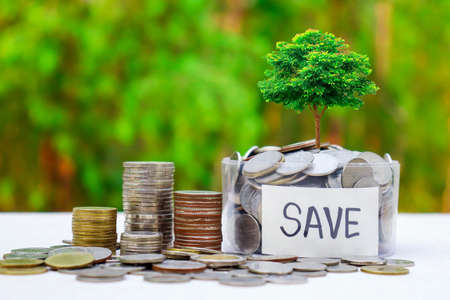 Trees that grow on coins on a natural background. Growth and saving concepts.