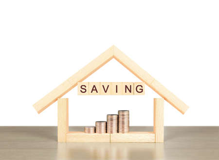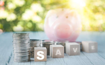 Business, Money and Saving Concept. Closeup of Englisg letter SAVING wooden block with stack of gold coins on blue background.
