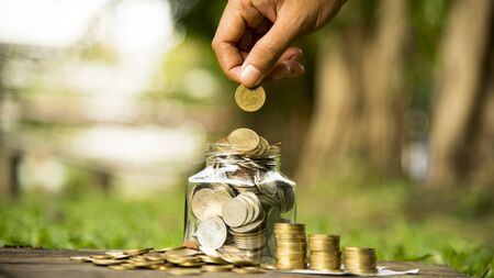 Man holding coins putting in glass, saving money for finance accounting concept.