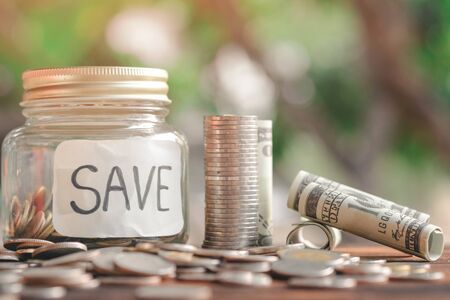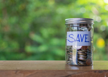Save word on wooden block and jar full of coins on blurred green natural background. Saving money and investment concept.